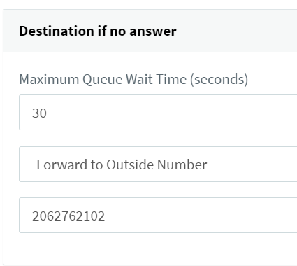 - Maximum Queue Time is where you set how long someone will remain in the call queue before they are sent to the external cell phone