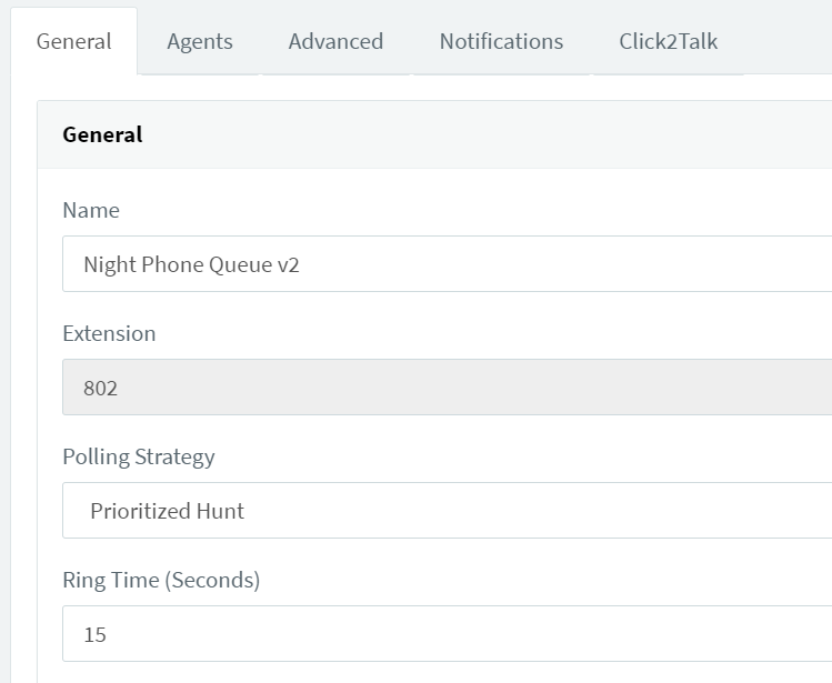 - Under the General tab, you can change the Ring Time (Seconds) to how long you want to ring a 3CX extension before it moves on to the next person on the Agents list